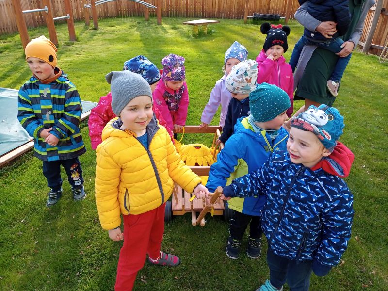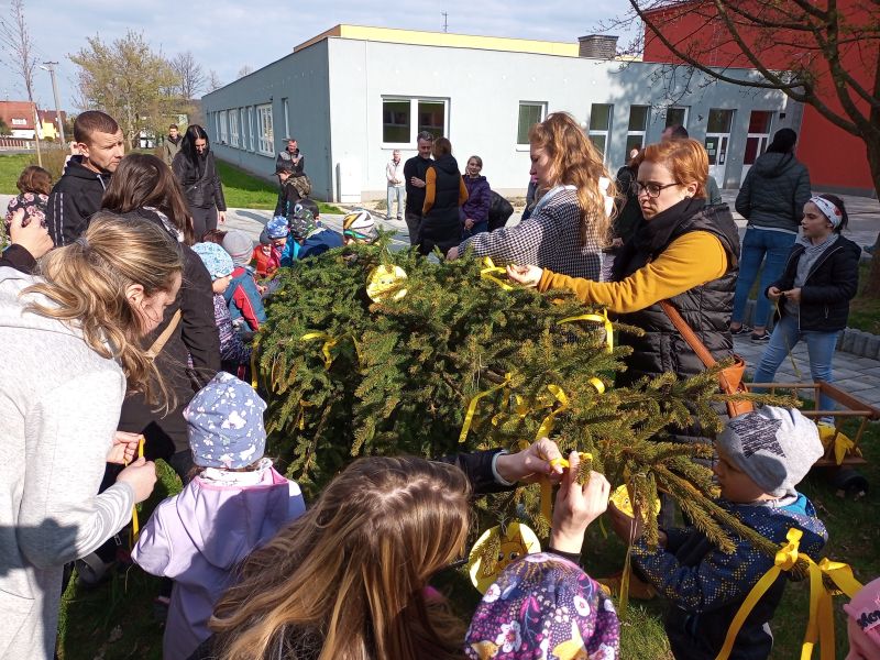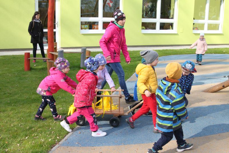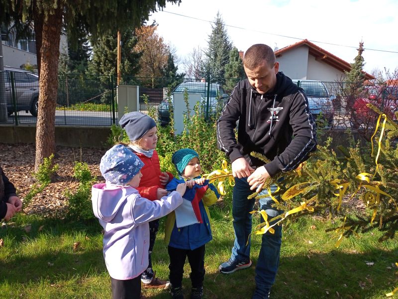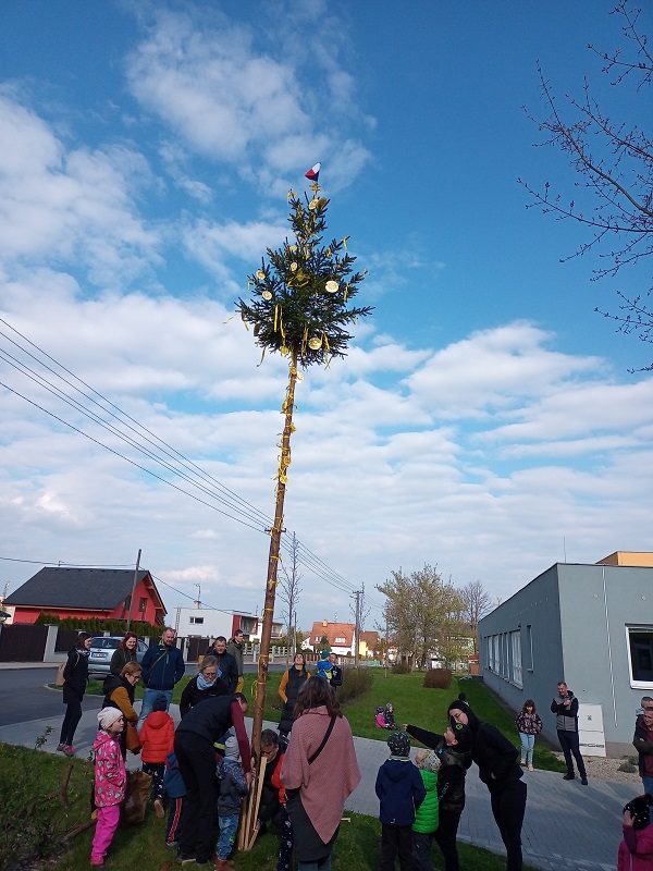 Konec dubna bývá ve znamení stavění májek a my jsme se na stavění té naší celý měsíc těšili. Protože letos se zatím sluníčku na oblohu moc nechce, rozhodli jsme se, že si tentokrát postavíme májku sluníčkovou. 27. dubna odpoledne jsme pozvali všechny dospěláky, hlavně tatínky, aby dětem ukázali svou zručnost a silácké dovednosti. Před školkou na děti čekala ještě nic netušící májka, kterou nám i letos obstaral pan Karel Baran starší. Abychom ji mohli společně nazdobit, museli kluci a děvčátka nejdříve najít stuhy a sluníčka. Takže se hledalo ve všech koutech školkového hřiště tak dlouho, až se vše našlo. A pak se zdobilo a zdobilo. Někdo procvičil vázání uzlíku sám, někdo to nechal na mamince, či taťkovi. Další hádanka pro děti byla, co by nemělo chybět na ozdobené májce? A představte si, děti uhádly. Tatínek dobrovolník připevnil na vrcholek ještě i uhádnutou českou vlajku, a to hlavní a důležité mohlo být odstartováno. 3,2,1 start a všichni siláci na jeden zátah májku postavili, aby se mohla ukázat všem v celé své kráse. Pak si všichni s chutí za zdařilou práci zatleskali. Kluci při ustavování ukázali, že si dokážou poradit i bez patřičného nářadí. Tatínkové na ně byli určitě pyšní. Po společně vykonaném díle zaručeně všem vyhládlo. Ale i o hladová bříška bylo postaráno. Na zahradě čekaly dobroty z kuchyně klubových maminek. Děti si mohly zbytek odpoledne užít tancem a společným dováděním s kamarády a se svými rodiči. Sluníčková májka jen v klidu přihlížela. Doufáme, že nám přivolá vytoužené sluníčko a my děkujeme všech ochotným lidičkám, kteří nám pomohli se zdařilým průběhem akce.