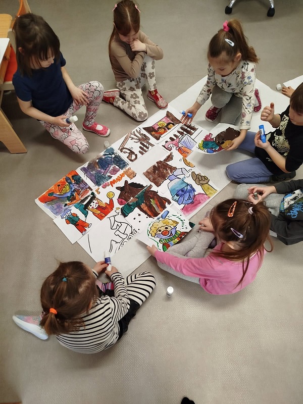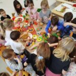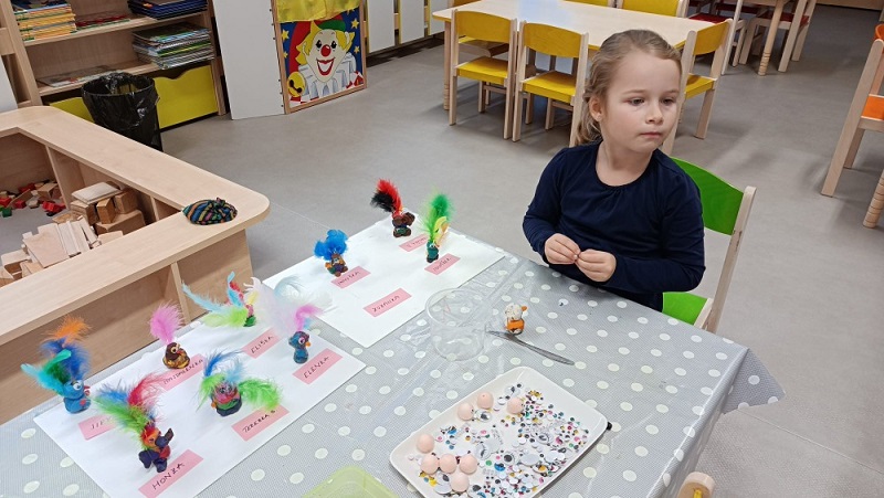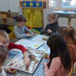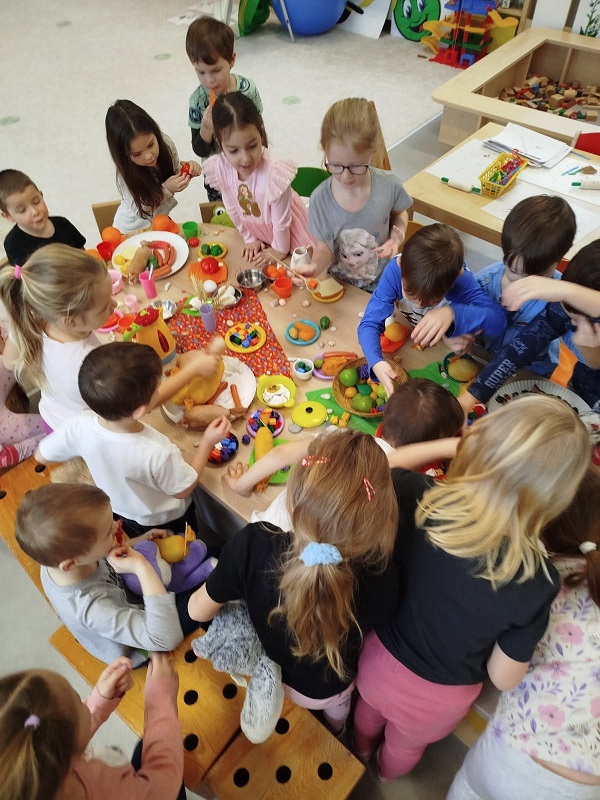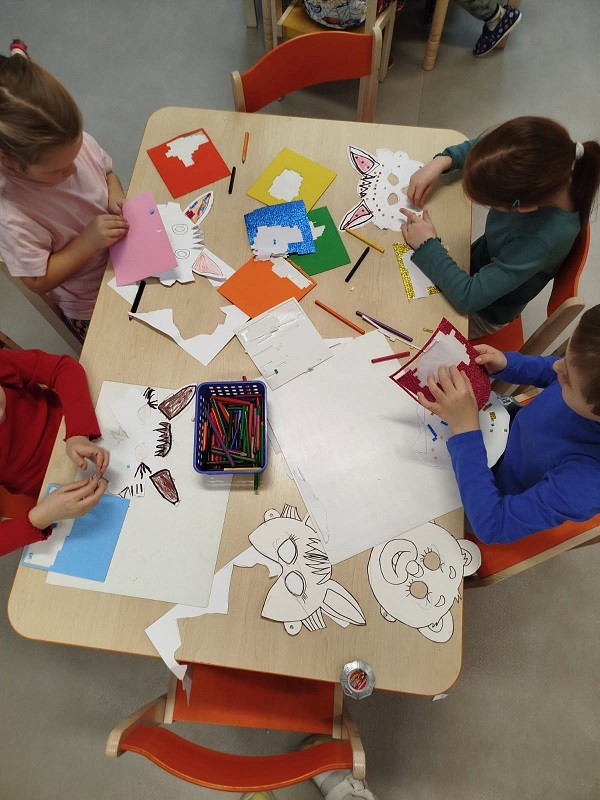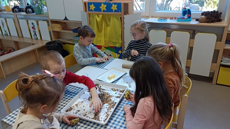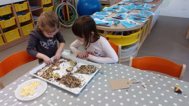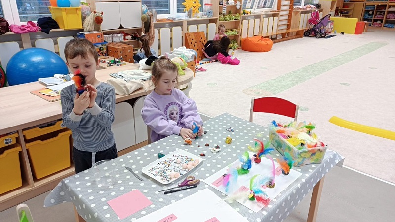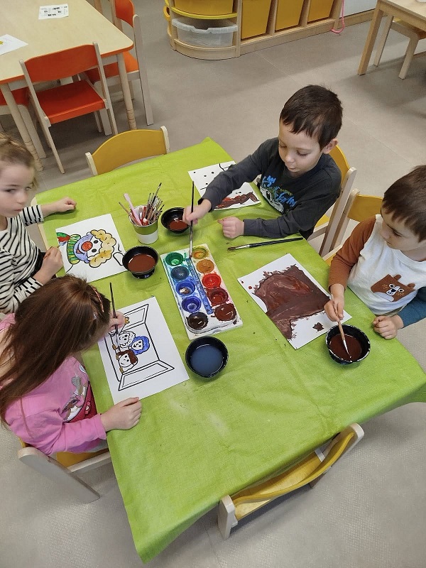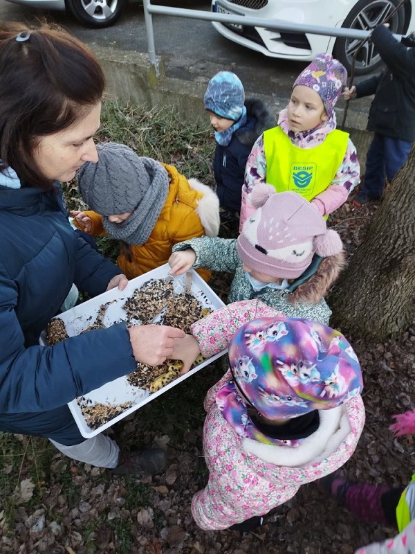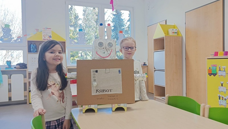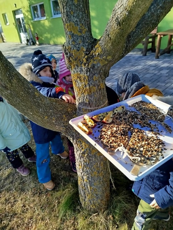 „Je nám smutno, máme hlad, kdo nám přijde něco dát?“ V únoru se děti dozvěděly spoustu zajímavostí o ptačí říši. Povídali jsme si o tom, kde ptáci bydlí, co tam dělají a čím se živí. Společně jsme jim vyrobili různé druhy ptačí potravy, které jsme rozmístili v okolí školky. Měli jsme štěstí – zahlédli jsme veverku, která si odnesla naše rozčtvrcené jablíčko napíchané semínky do svého doupěte. Děti měly obrovskou radost! Protože jsme velmi zvídaví, zkoumali jsme pod mikroskopem strukturu peří a poté jsme pod vodou objevili odpověď na otázku: „Proč ptáci nepotřebují deštník?“ Zkoumání a objevování nás tak nadchlo, že jsme se na chvíli stali vynálezci. S robotem Matýskem jsme poznali různé druhy materiálů a poté si každý nakreslil svého vlastního robota tuší. Děti si také procvičily jazykové dovednosti – hledaly skrytá slova v hádankách a rozlišovaly dlouhé a krátké slabiky. S velkým nadšením manipulovaly s Bee-Bot včelkou a podle mapky s návodem hledaly robotí poklad. Celou naši vědeckou cestu završila píseň „Pokusy“ od L. Jakešové. Poté následovala výprava do lidského těla. Zhluboka se nadechněte… Máme srdce na správném místě? Vnímáme všemi smysly. Ve zdravém těle zdravý duch. Společnou prací se dětem podařilo pojmenovat jednotlivé části těla. Děti se naučily pomocí přiřazování a lepení, co se schovává uvnitř našeho těla a kde najdeme různé důležité orgány (mozek, srdce, plíce, žaludek, střeva). Jednoduchými zábavnými pokusy jsme si přiblížili a vysvětlili, jak je důležité používat mýdlo při mytí rukou a zakrývat si ústa i nos. Nejvíce děti zaujalo vnímat a rozlišovat pomocí smyslů. Zapojili a procvičili jsme zrak, sluch, hmat, čich i chuť. Únorový měsíc byl krátký a veselý. Veselý proto, že jsme měli masopust. Vyráběli jsme masopustní škrabošky a vymalovali vodovými barvami maxi omalovánku s tradičním masopustním průvodem. Pomocí skládanek hravou formou upevnili tradiční masopustní maškary, procvičili si techniku stříhání a samostatně se rozhodovali o výběru obrázku. Nesměla chybět masopustní písnička „Už je tady Masopust“. K masopustním oslavám patří také dobré jídlo a námětová hra „Připravujeme si masopustní hostinu“. Děti použily nádobí, potraviny z dětské kuchyňky, modelovaly masopustní dobroty a vyráběly masopustní jitrnici ze staré punčochy. Následovalo společné hodování u stolu. Do děje vstoupila i gymnastika mluvidel – mlaskání, srkání, foukání, olizování. Všichni jsme si užili veselý masopust, který jsme ukončili tradičním masopustním průvodem obcí.