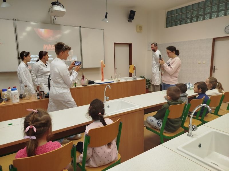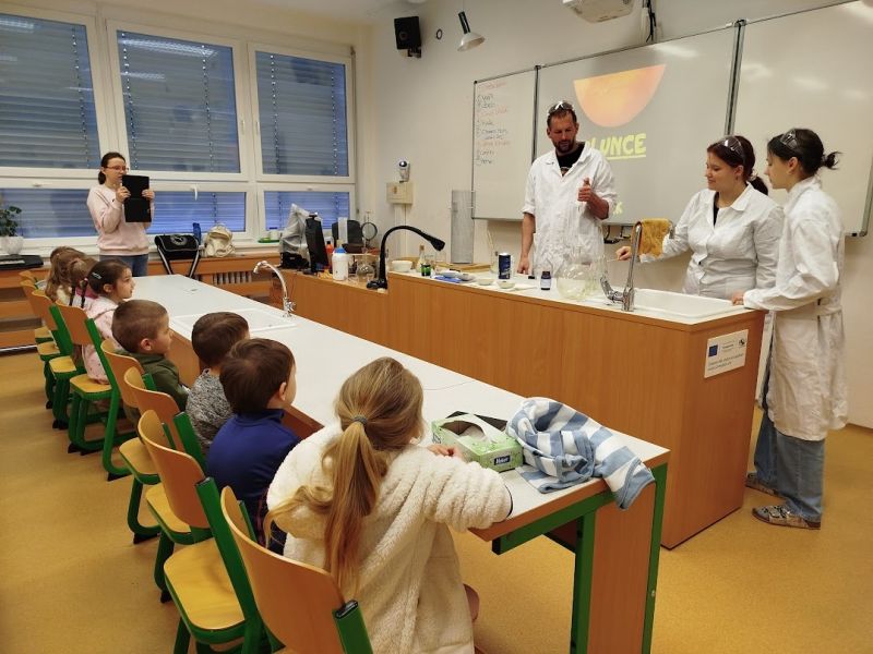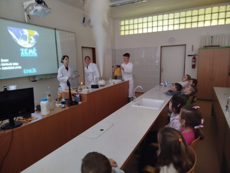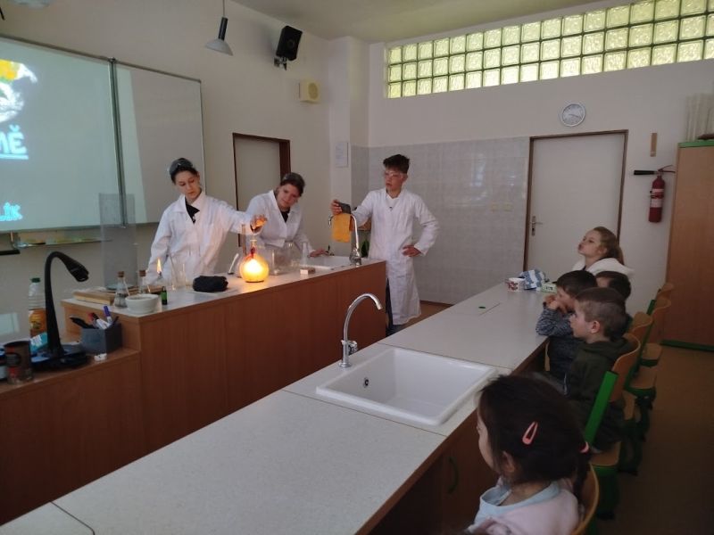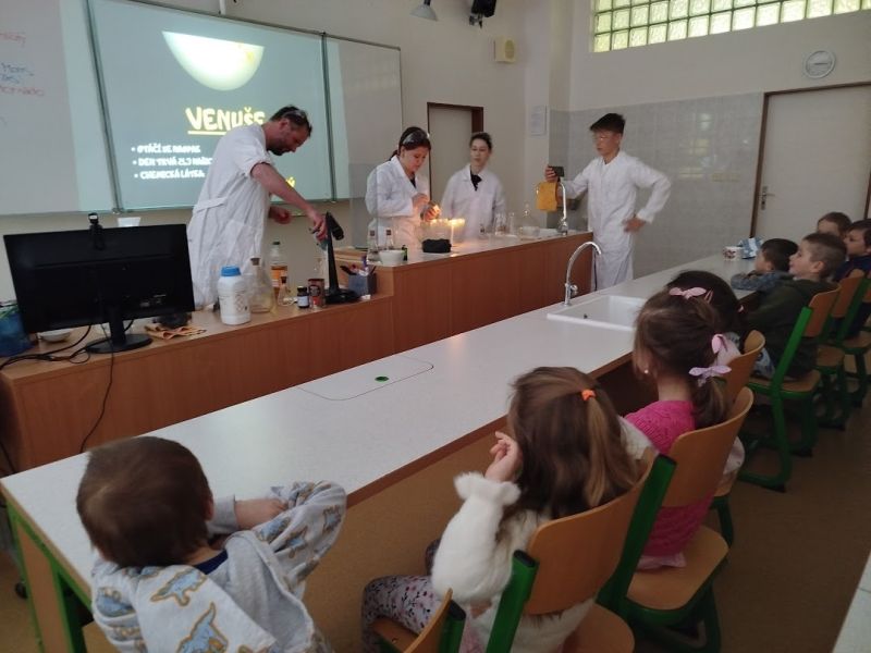 Dostali jsme pozvání do základní školy, kde pro nás pan učitel Hnilica se žáky připravili dopoledne poznání a pozorování. Každá planeta byla dětem představena prostřednictvím zajímavého pokusu, který jim ukázal, co je pro danou planetu typické. V některých chvílích se ozvalo bouchnutí nebo hlasité rány, na stole se zvedly nadýchané obláčky, bílá pěna, která stoupala jako v pohádce „ Hrnečku vař“. Objevily se plamínky, které bez vzduchu rázem zmizely. A pan učitel, ten nám na chvíli připadal jako opravdový kouzelník – mávl rukou, která začala skutečně hořet ohněm. Víme, že tyto pokusy mohou dělat jen velcí a zkušení kouzelníci – učitelé a jejich pomocníci…. Na závěr nechyběla pochvala od pana učitele, a dokonce jsme dostaly další pozvání k návštěvě. Moc děkujeme za krásně připravený program a těšíme se na další společné setkání.