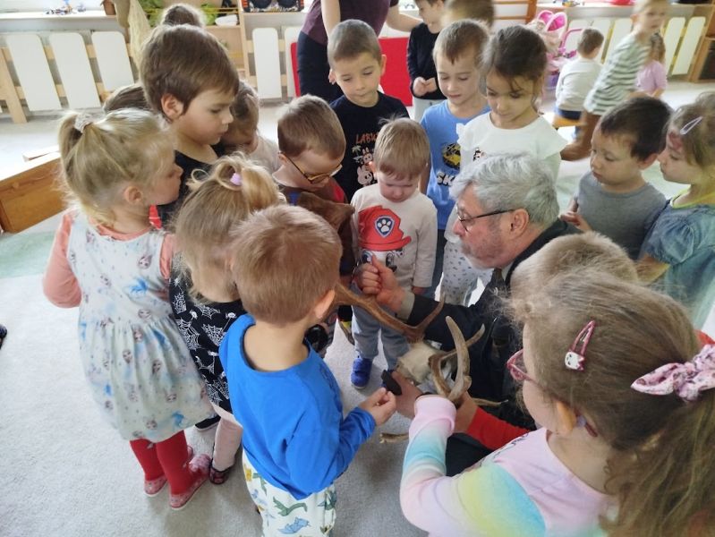 Začátkem listopadu k nám do školky zavítal pan Frank, místní myslivec. Společně s mladšími dětmi jsme si poslechli povídání o zvířátkách, která žijí v našem okolí, a o tom, jak se o ně myslivci starají. Přinesl s sebou paroží jelena, bažanta a křepelku, abychom si mohli, některé věci prohlédnou zblízka a lépe si představit život v lese. Dozvěděli jsme se také, jaký je rozdíl mezi zajícem a králíkem. Nejprve jsme si mysleli, že máme v králíkárně zajíce. Teď už víme, že zajíc se rodí se srstí a otevřenýma očima, zatímco králíček se rodí nahý a slepý, takže musí být pořád s maminkou. Představte si, že obora je něco jako velká zahrada, kde se pasou mufloni a další zvířátka. Děti měly také zajímavé otázky. „Pane myslivče, když má srnec pět let, je to ještě dítě?“ Pan Frank nám vysvětlil, že ne – je to dospělý srnec. „A víte, kdo je největším pomocníkem pana myslivce?“ To už také víme – je to pes! Společně jsme se dozvěděli ještě spoustu dalších zajímavých věcí. Na závěr jsme si všichni zazpívali veselou písničku o psovi a zatleskali jsme panu myslivci na rozloučenou.