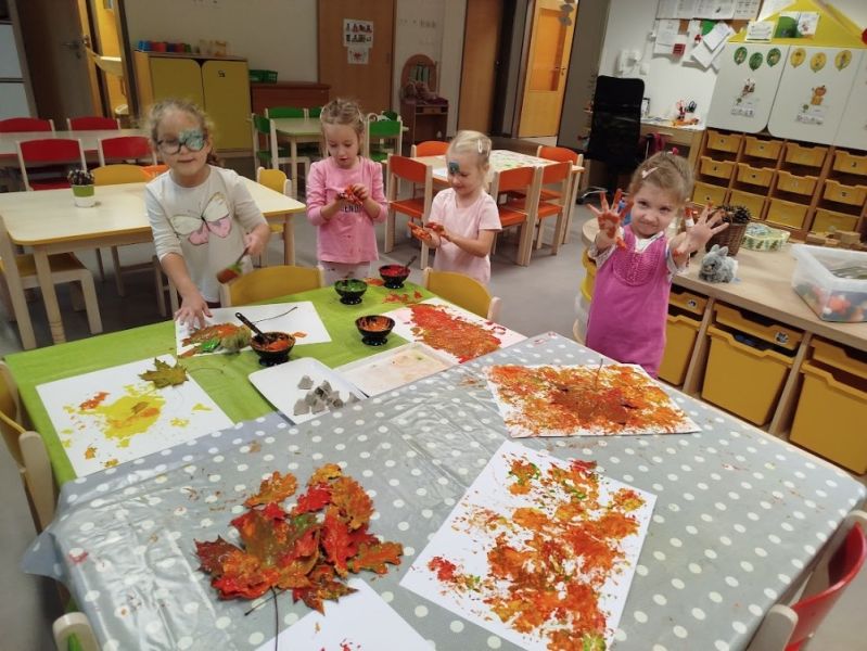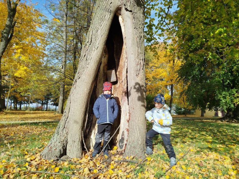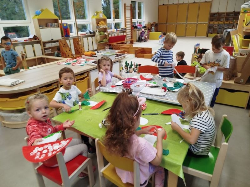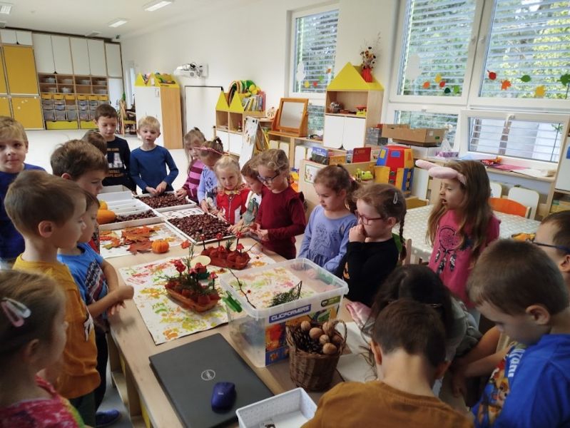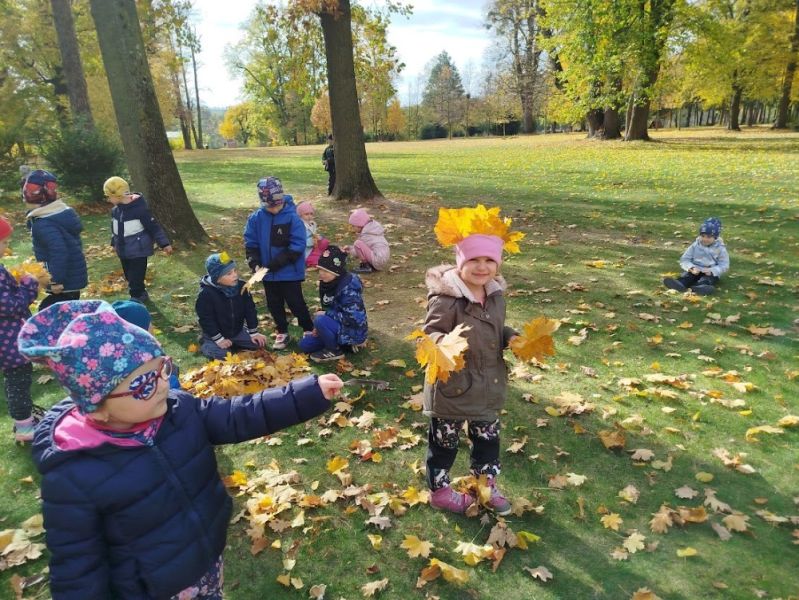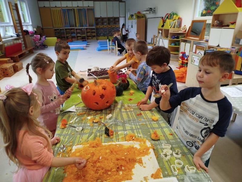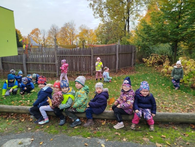 Se svátkem svatého Václava k nám přišel podzim v celé své kráse. Děti se vydaly objevovat, jak příroda souvisí s tradicemi a jaké poklady ukrývá les i zahrada. Na vycházkách sbíraly kaštany, žaludy, šišky i barevné listy. Zkoumaly houby, učily se rozpoznávat jedlé od jedovatých a zjistily, že i z obyčejného houbového výtrusu může vzniknout kouzelná kresba. Když pak ve třídě tvořily muchomůrky z papíru, modelíny a nasbíraných přírodnin, všude to vonělo podzimem a fantazií. Veverka, která děti provázela při hrách, je naučila rytmizovat a cítit rytmus v pohybu i v řeči – a tak se z rytmizace stala radostná hudební hra, která doprovázela i jejich kroky na vycházkách. Podzimní dobrodružství vyvrcholilo strašidýlkovým dnem a oslavou Halloweenu. Děti vydlabaly dýni, která se pak proměnila ve světýlko vítající všechny příchozí před školkou. Společně navštívily i místní kostel a hřbitov, kde zapálily svíčku na hrobu. A protože bez pohybu by to nebylo ono, z papíru si vyrobily létající netopýry a zkoušely, komu budou mávat křídly nejrychleji. Podzim u nás zkrátka nebyl jen barevný, ale také plný poznání, tvoření a radosti z každého nového objevu.